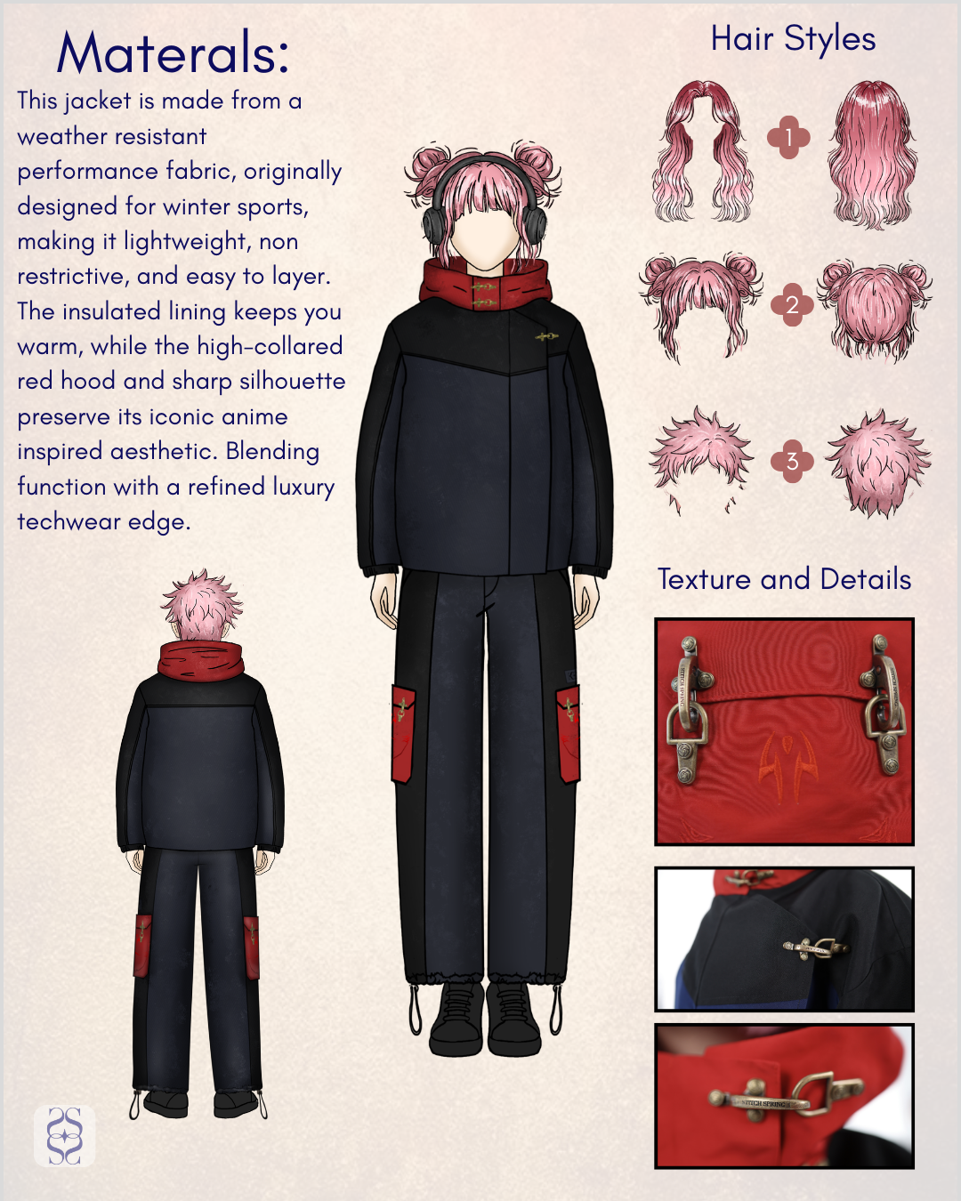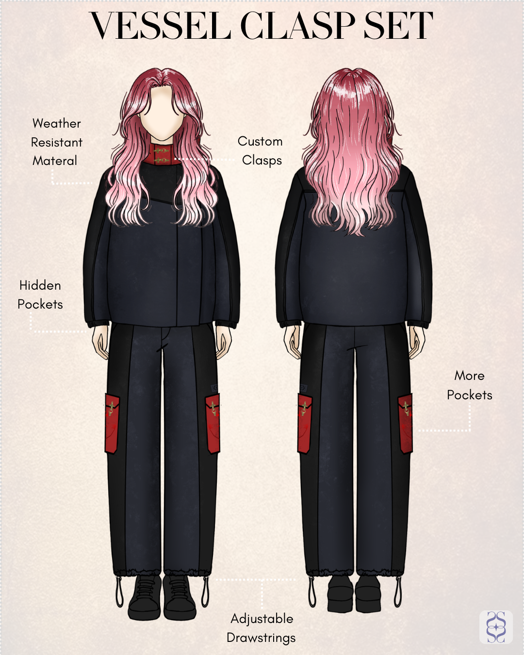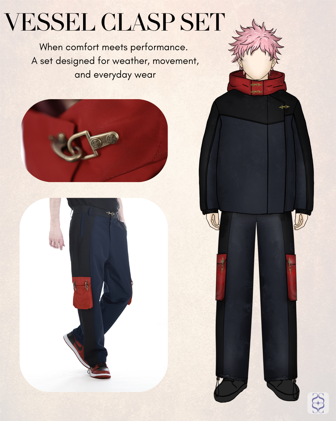 With a combination of subtle and bold design cues inspired by an iconic character, the Vessel Clasp Set lets fellow fans instantly recognize the reference, while everyone else sees a luxurious piece with the same attention to detail the craftsmanship as ultra luxury main brands without the $800+ price tag. Expect compliments wherever you go, as this jacket effortlessly draws attention and admiration. The Vessel Clasp Jacket and Pants are the perfect addition to your elevated anime-inspired wardrobe.