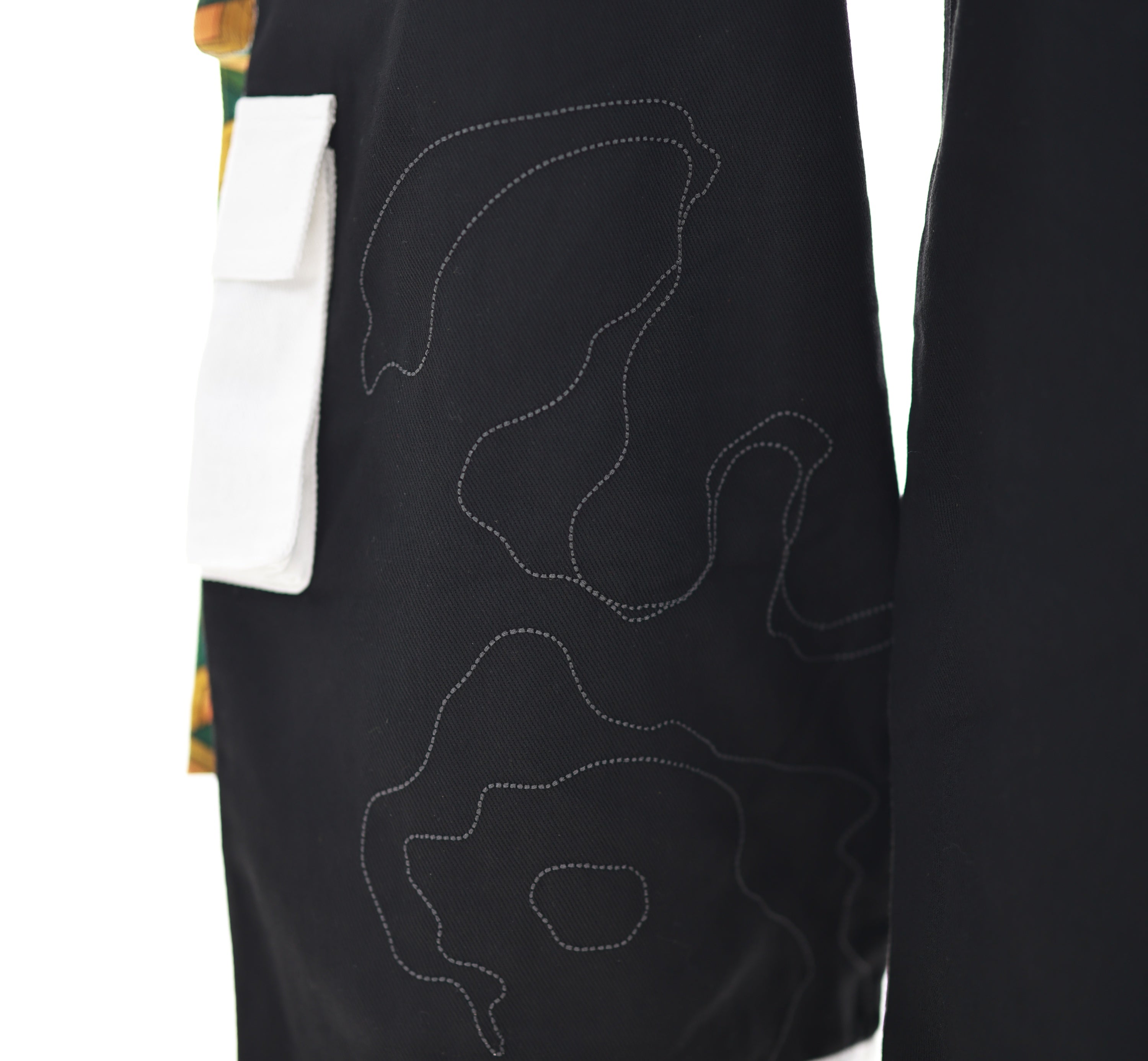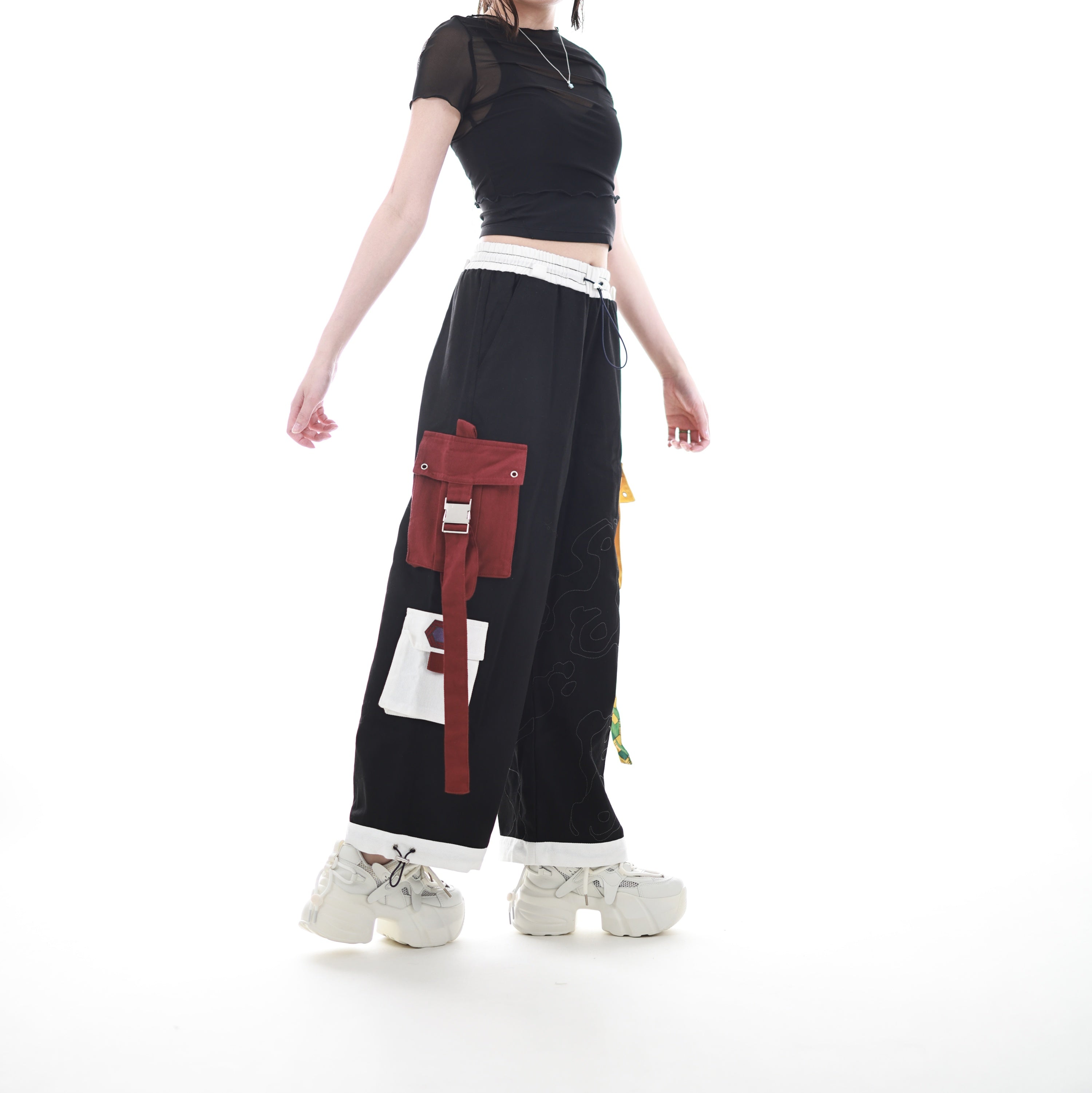 All pieces from the slayer collection feature some of the most unique and detailed embroidery, knit & denim designs we have ever made. The fabric is made from a very high quality denim material. The pockets of these pants feature a unique appliqué pattern that makes them look very luxurious. The embroidery also adds a unique touch to the design and makes it very interesting for casual outfits or subtle cosplays. The embroidery has been specially modified so that it is not itchy on the skin and blends well with the denim fabric. The cargos can be tightened at the bottom so they can match even more styles. The design is supposed to make you comfortable while standing out in a positive way.  The elastic in the back also ensures an extra comfortable fit without getting too tight.