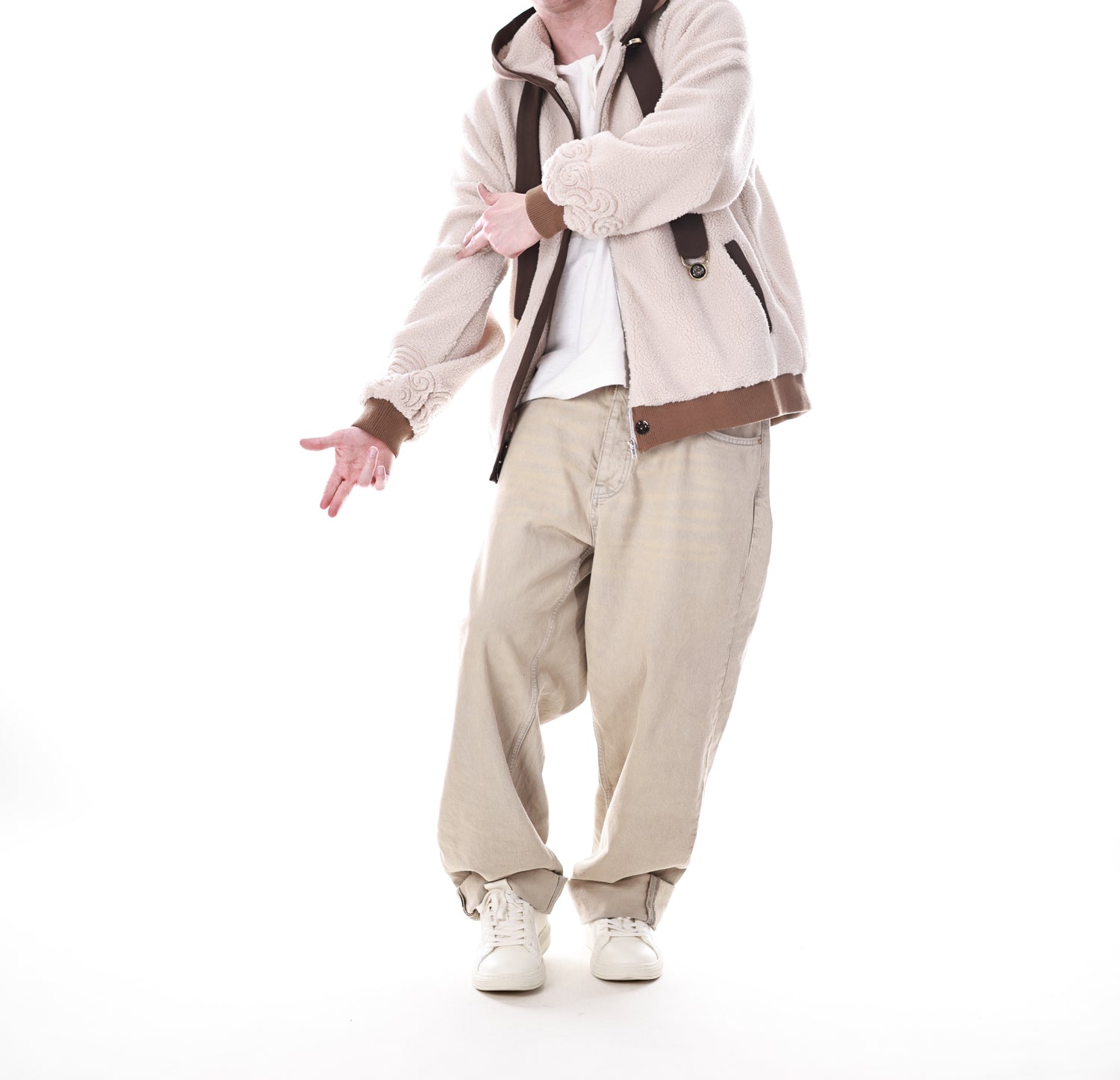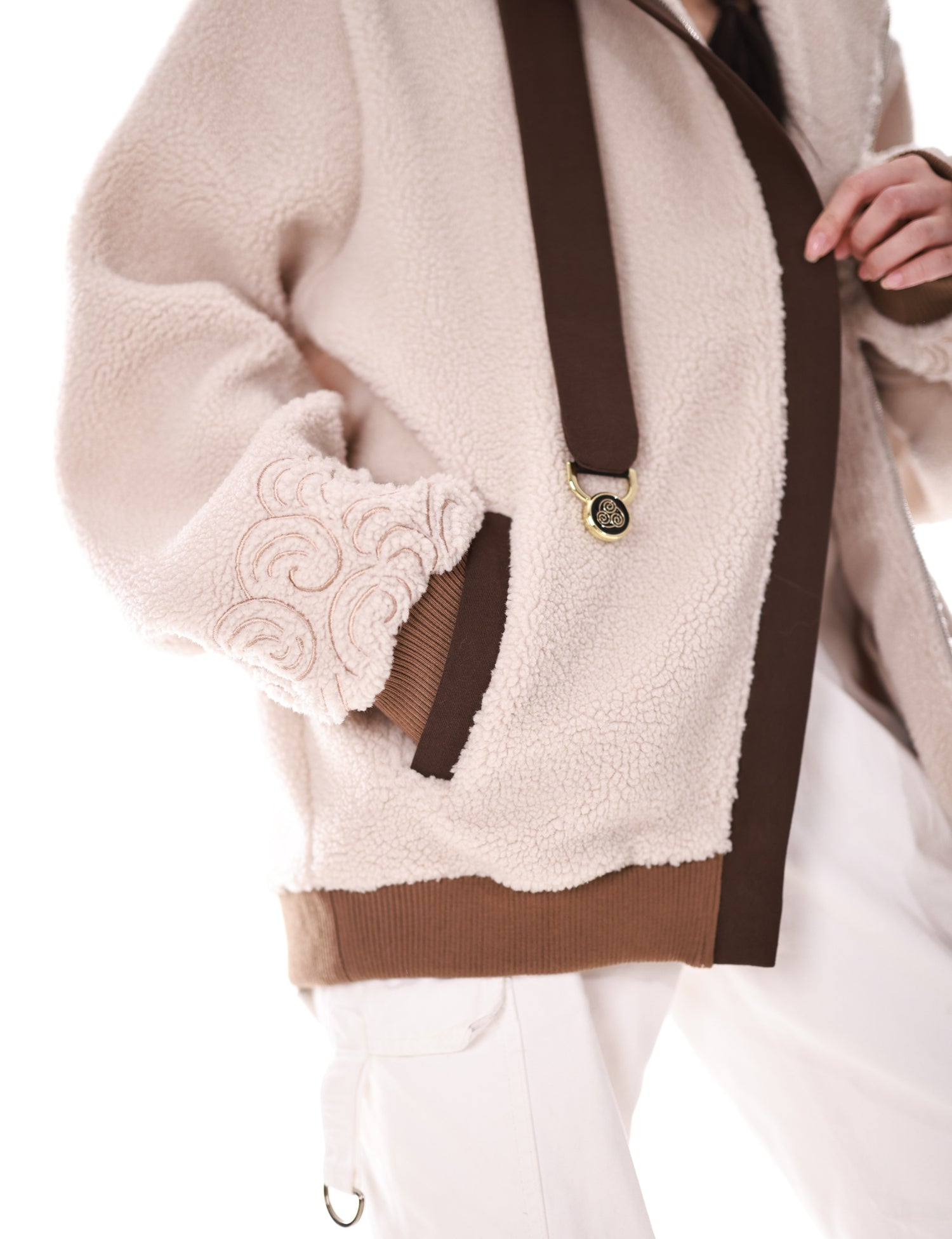 Cloudy Soft Sherpa Material on the outside and likely the softest fleece you will ever feel on the inside fully lined throughout the body and sleeves.